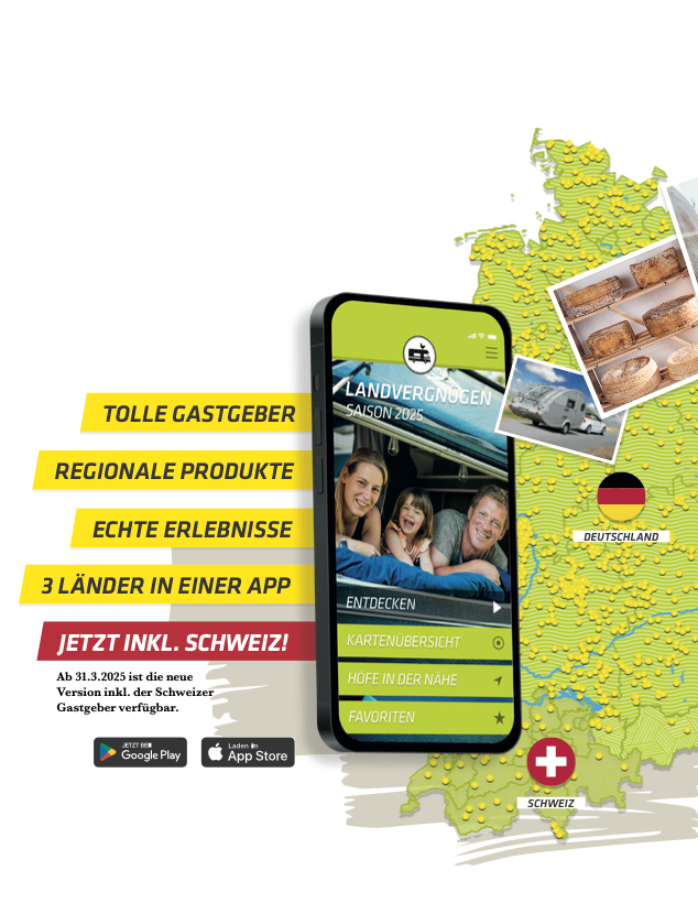 Landvergnügen ist ein Reise - und Stellplatzführer für Camping-Begeisterte, die mit Wohnmobil, Wohnwagen oder Dachzelt unterwegs sind. Das Angebot von Landvergnügen ermöglicht es, auf ausgewählten Bauernhöfen, Weingütern oder Gärtnereien in Deutschland, Österreich und der Schweiz zu übernachten.